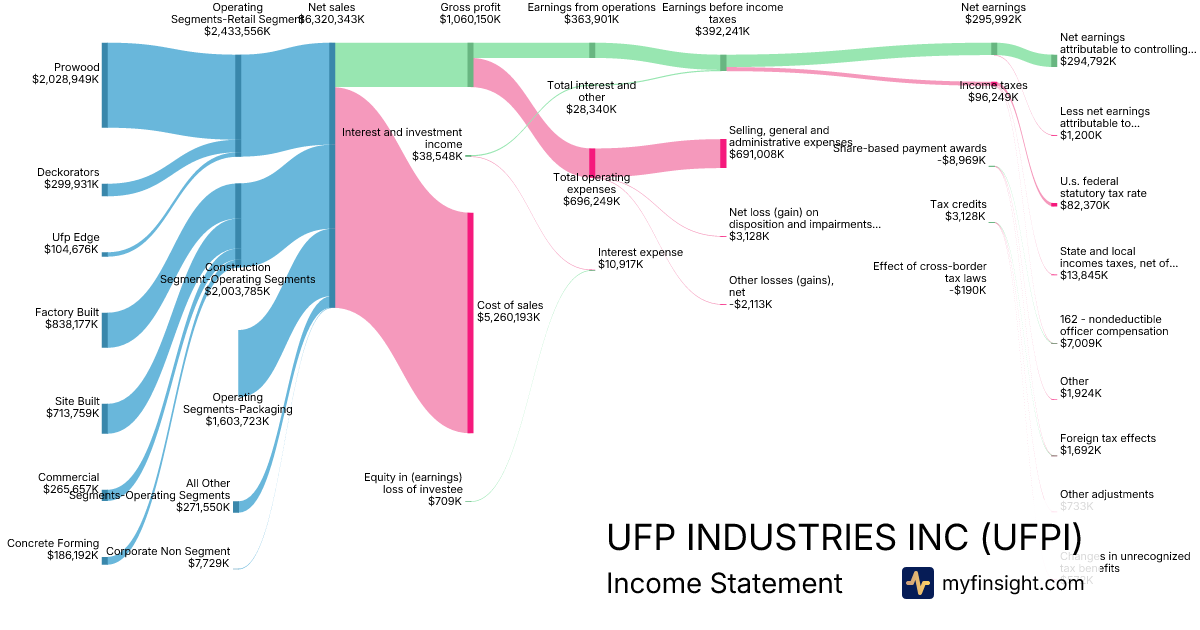 For the year ending 2025-12-27, UFPI made $6,320,343K in revenue. $294,792K in net income. Net profit margin of 4.66%.