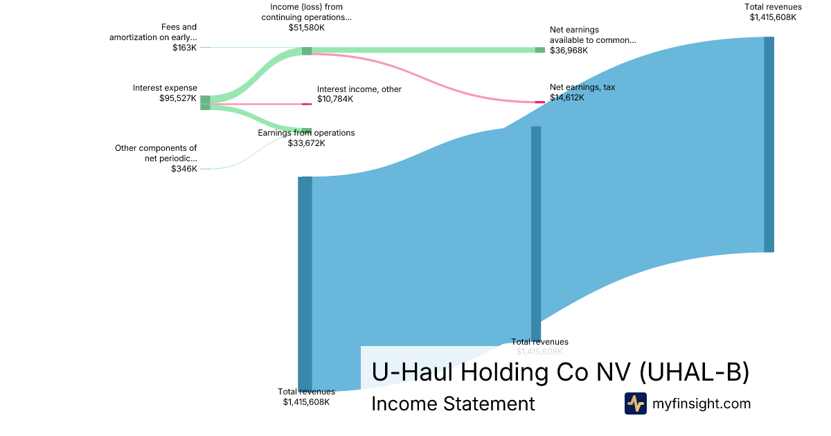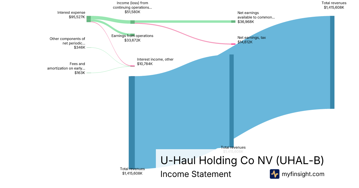 For the quarter ending 2025-12-31, UHAL-B made $1,415,608K in revenue. $36,968K in net income. Net profit margin of 2.61%.
