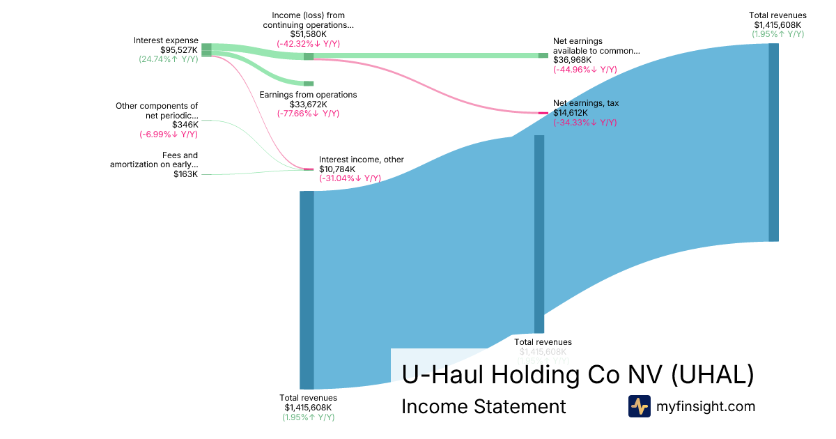 For the quarter ending 2025-12-31, UHAL made $1,415,608K in revenue. $36,968K in net income. Net profit margin of 2.61%.