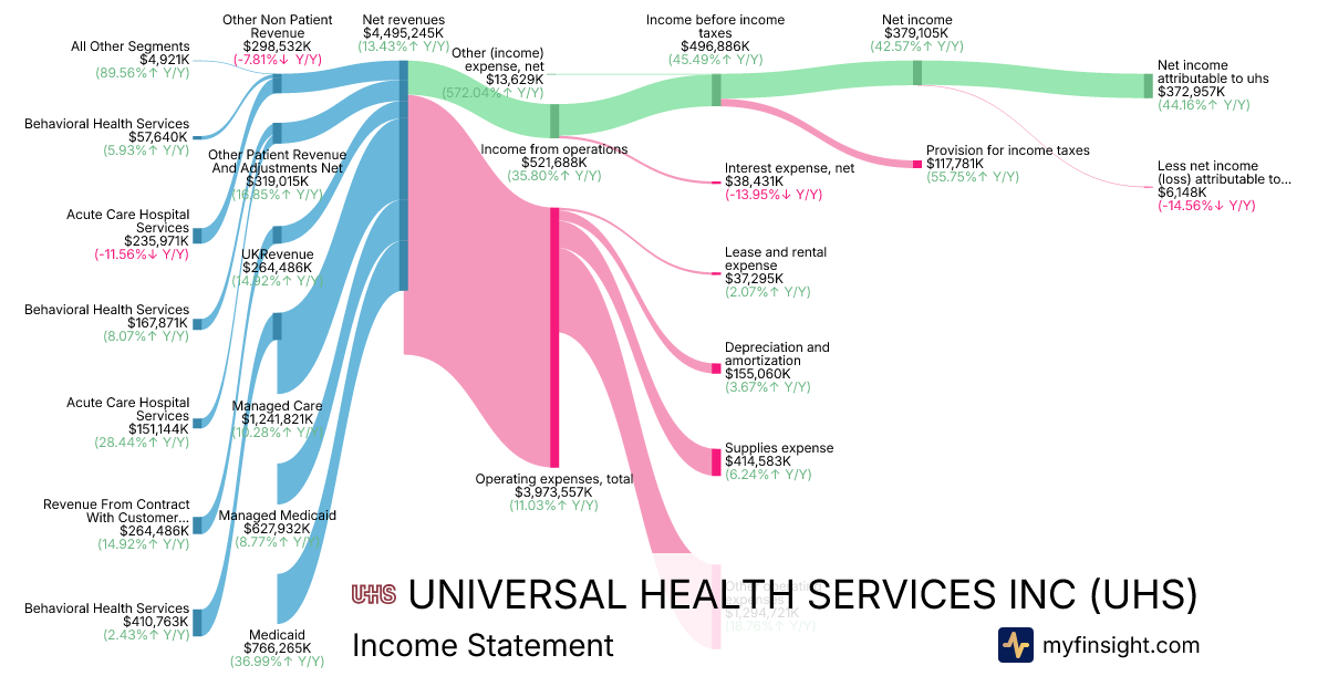 For the quarter ending 2025-09-30, UHS made $4,495,245K in revenue. $372,957K in net income. Net profit margin of 8.30%.