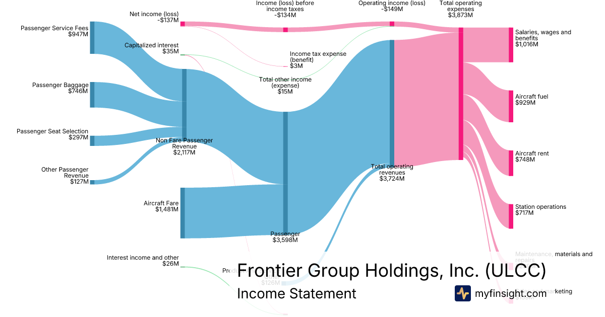 For the year ending 2025-12-31, ULCC made $3,724M in revenue. -$137M in net income. Net profit margin of -3.68%.