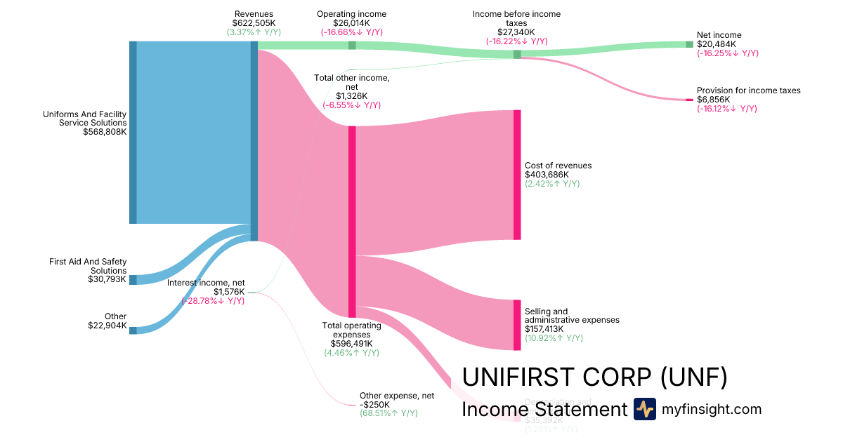 For the quarter ending 2026-02-28, UNF made $622,505K in revenue. $20,484K in net income. Net profit margin of 3.29%.