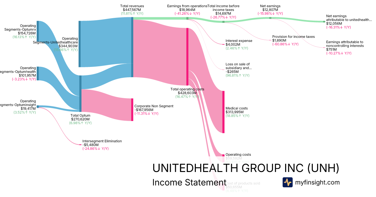 For the year ending 2025-12-31, UNH made $447,567M in revenue. $12,056M in net income. Net profit margin of 2.69%.