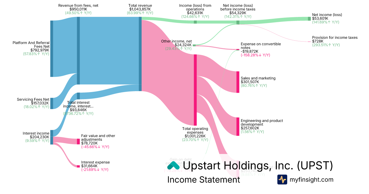 For the year ending 2025-12-31, UPST made $1,043,857K in revenue. $53,601K in net income. Net profit margin of 5.13%.