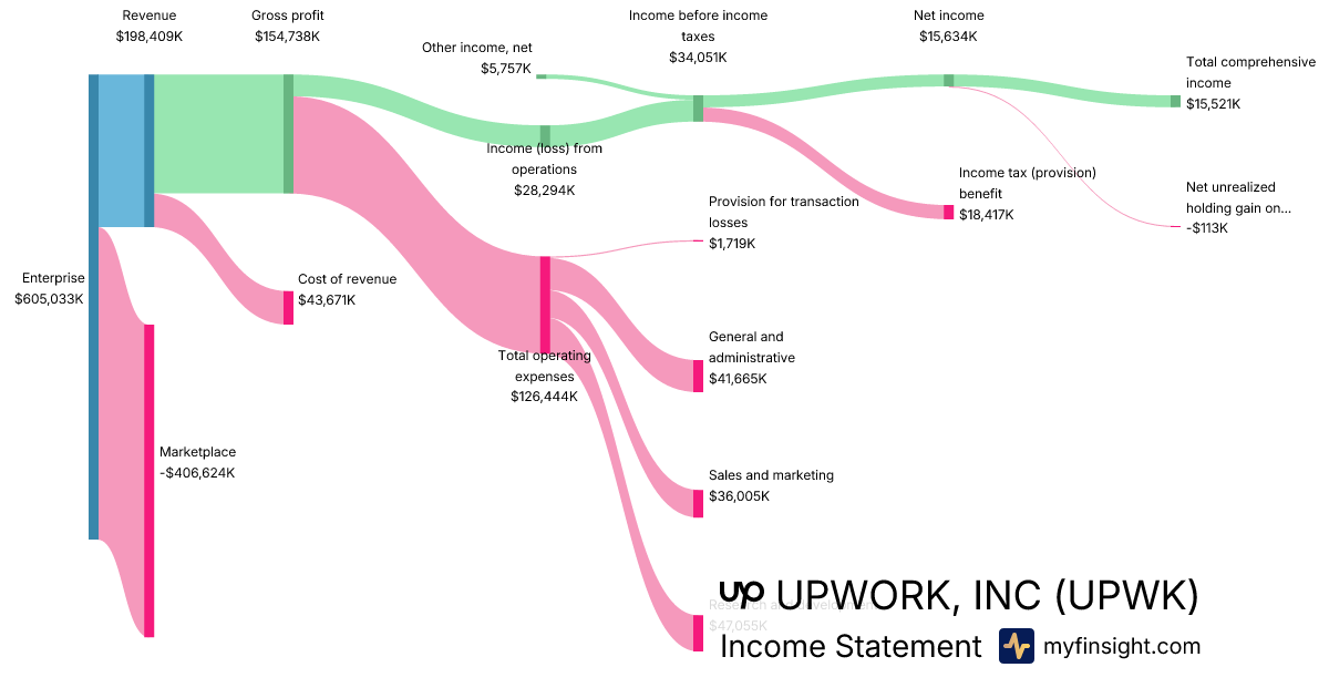 For the year ending 2025-12-31, UPWK made $787,784K in revenue. $115,915K in net income. Net profit margin of 14.71%.