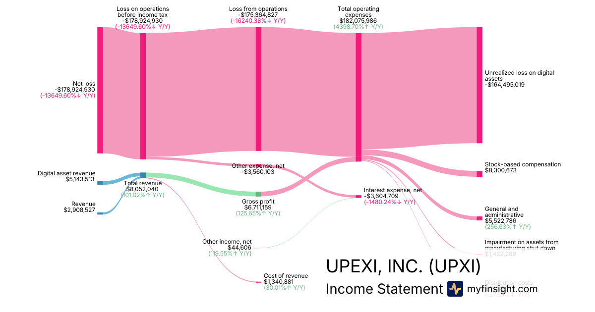 For the quarter ending 2025-12-31, UPXI made $8,052,040 in revenue. -$178,924,930 in net income. Net profit margin of -2222.11%.