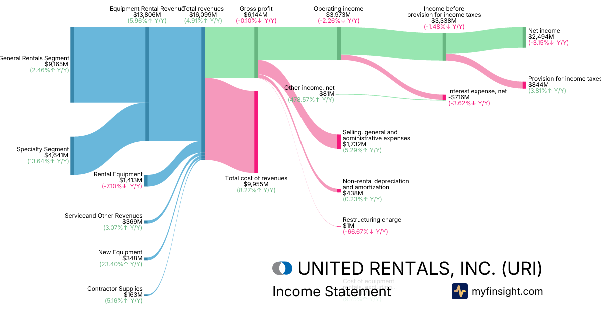 For the year ending 2025-12-31, URI made $16,099M in revenue. $2,494M in net income. Net profit margin of 15.49%.