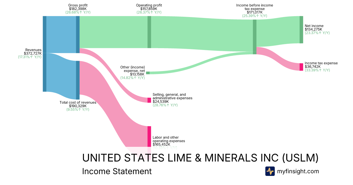 For the year ending 2025-12-31, USLM made $372,727K in revenue. $134,275K in net income. Net profit margin of 36.03%.