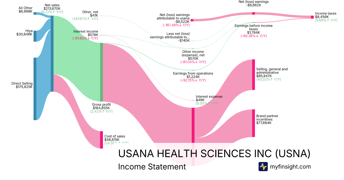 For the quarter ending 2025-09-27, USNA made $213,670K in revenue. -$6,522K in net income. Net profit margin of -3.05%.