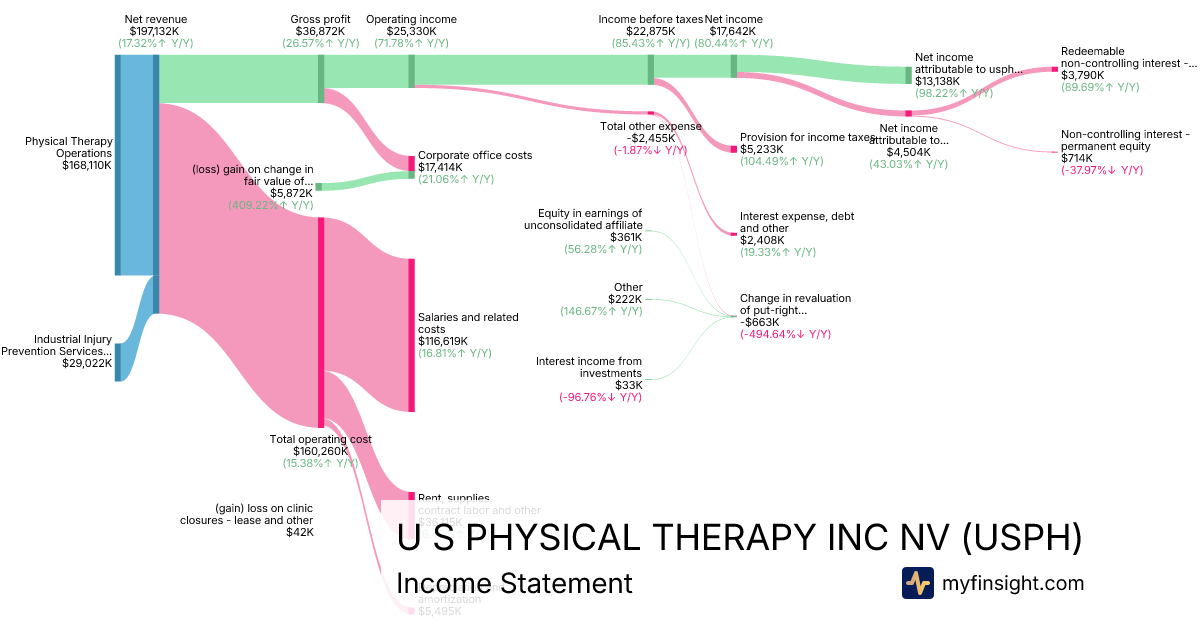 For the quarter ending 2025-09-30, USPH made $197,132K in revenue. $13,138K in net income. Net profit margin of 6.66%.