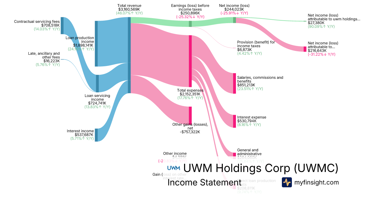 For the year ending 2025-12-31, UWMC made $3,160,569K in revenue. $27,380K in net income. Net profit margin of 0.87%.