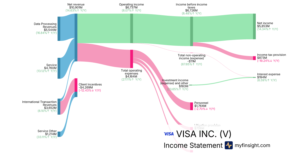 For the quarter ending 2025-12-31, V made $10,901M in revenue. $5,853M in net income. Net profit margin of 53.69%.