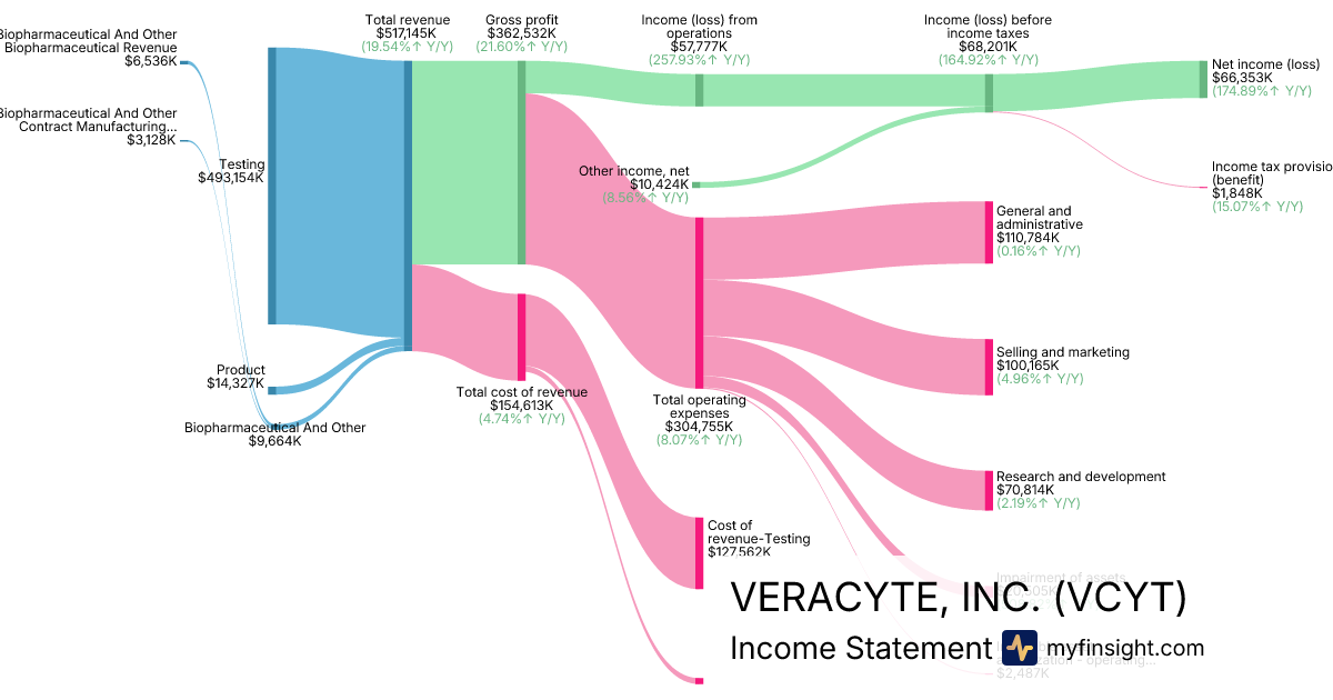 For the year ending 2025-12-31, VCYT made $517,145K in revenue. $66,353K in net income. Net profit margin of 12.83%.