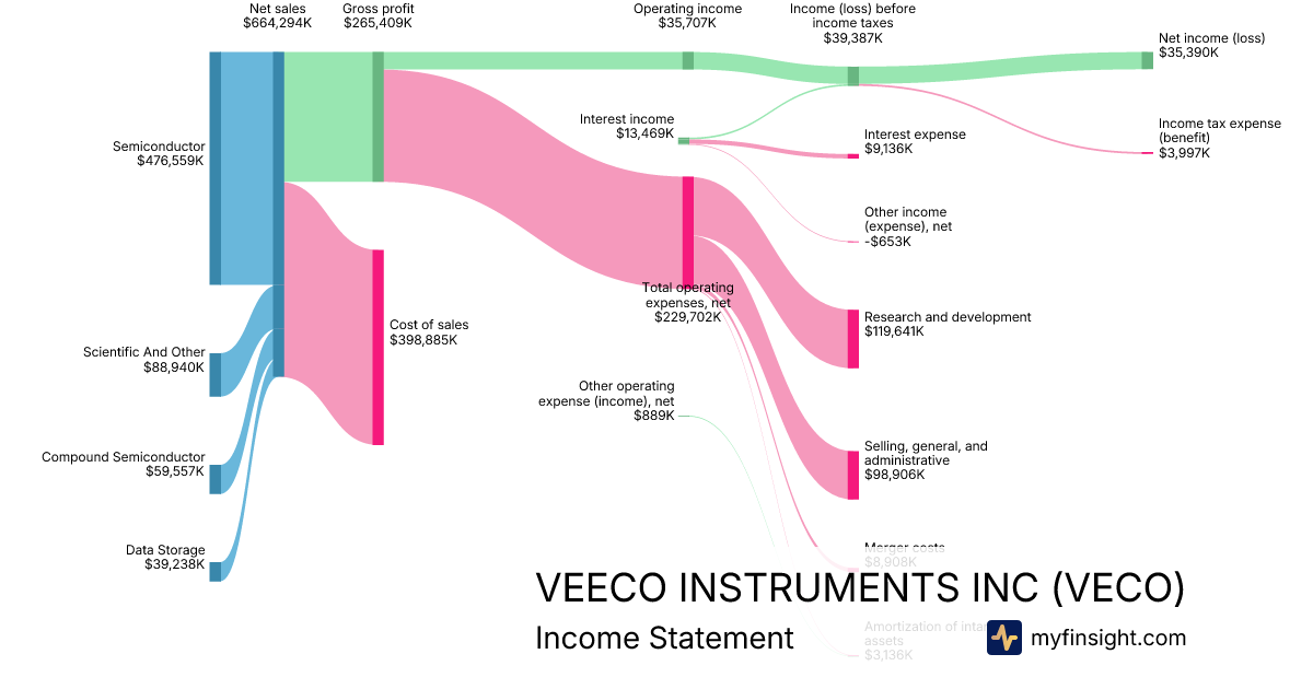 For the year ending 2025-12-31, VECO made $664,294K in revenue. $35,390K in net income. Net profit margin of 5.33%.