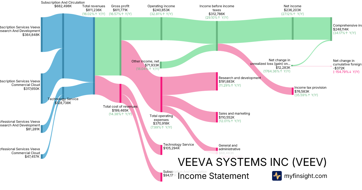 For the quarter ending 2025-10-31, VEEV made $811,236K in revenue. $248,114K in net income. Net profit margin of 30.58%.
