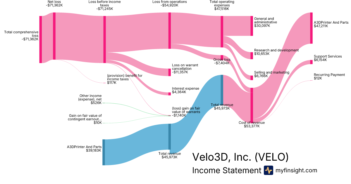 For the year ending 2025-12-31, VELO made $45,973K in revenue. -$71,362K in net income. Net profit margin of -155.23%.