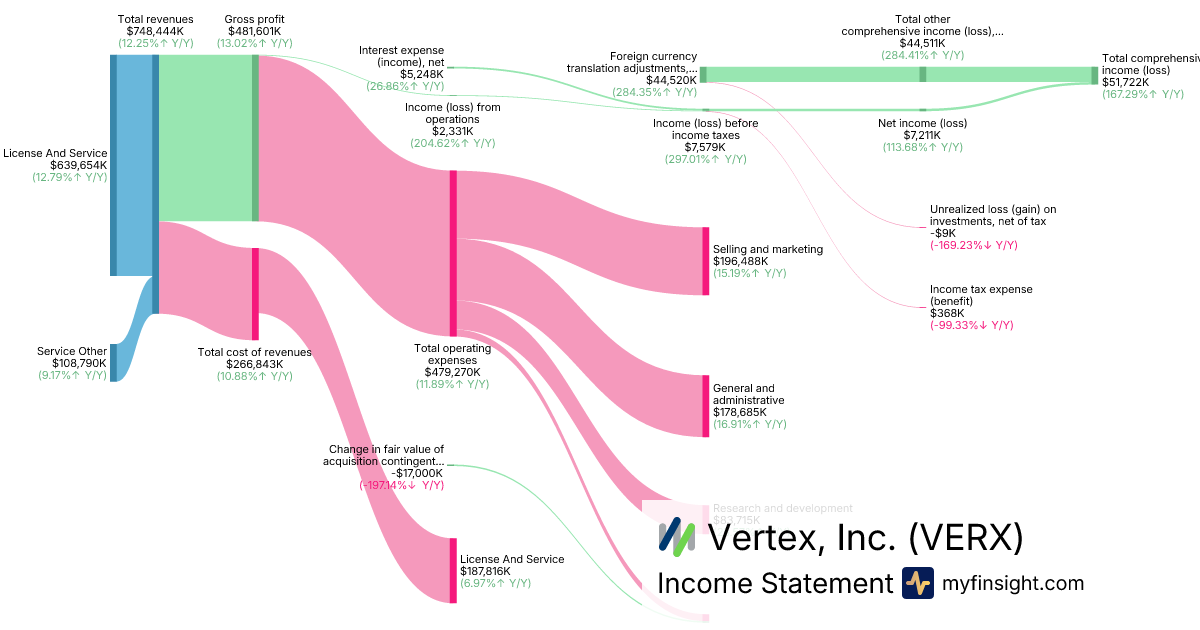 For the year ending 2025-12-31, VERX made $748,444K in revenue. $51,722K in net income. Net profit margin of 6.91%.