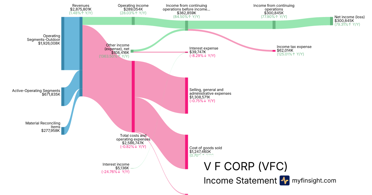 For the quarter ending 2025-12-27, VFC made $2,875,801K in revenue. $300,845K in net income. Net profit margin of 10.46%.