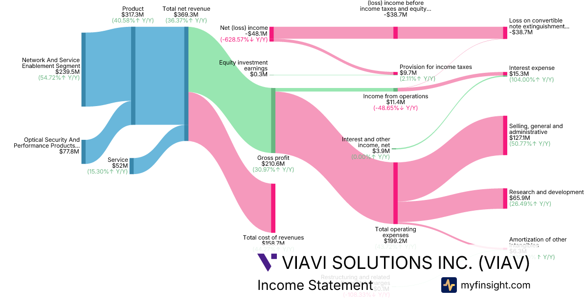 For the quarter ending 2025-12-27, VIAV made $369.3M in revenue. -$48.1M in net income. Net profit margin of -13.02%.