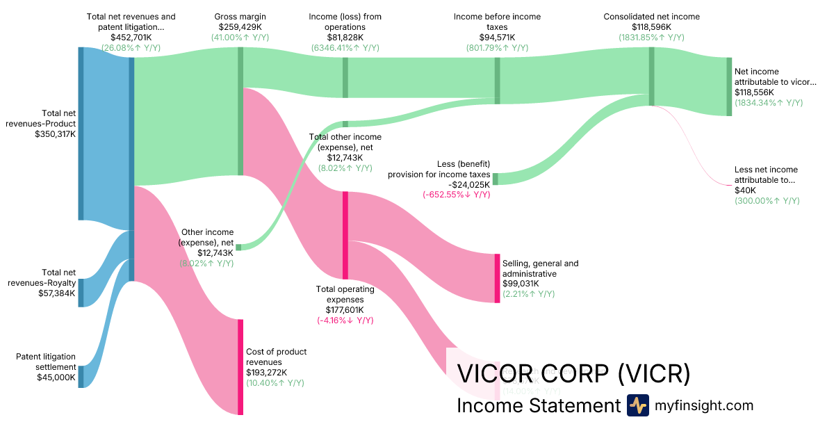 For the year ending 2025-12-31, VICR made $452,701K in revenue. $118,556K in net income. Net profit margin of 26.19%.