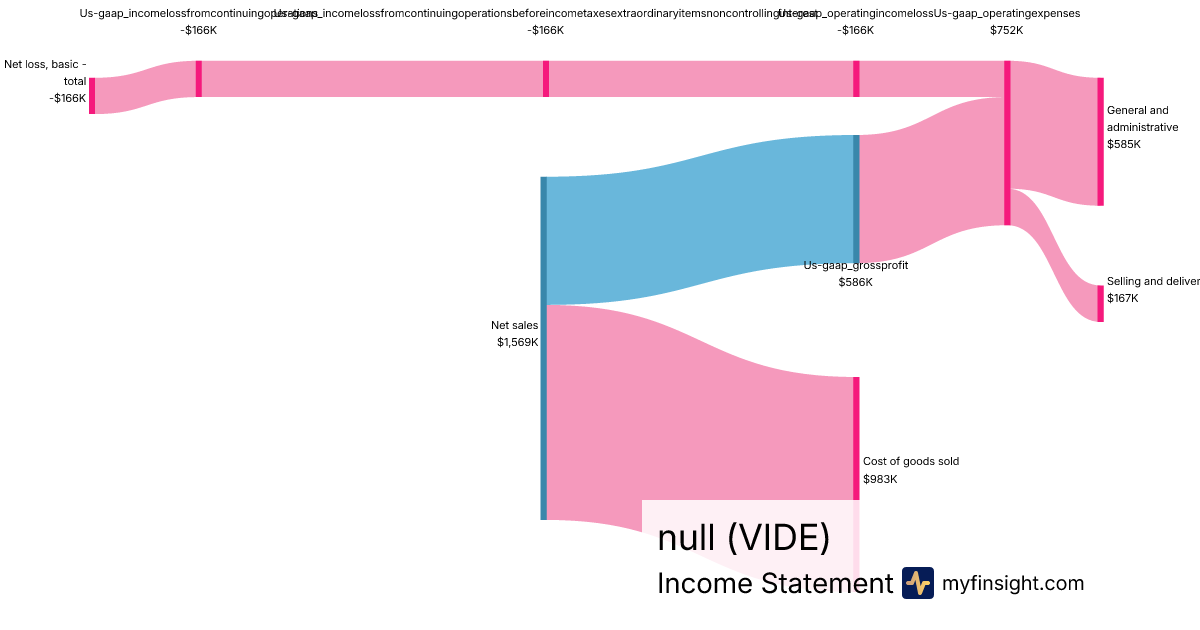 For the quarter ending 2024-08-31, VIDE made $1,569K in revenue. -$166K in net income. Net profit margin of -10.58%.