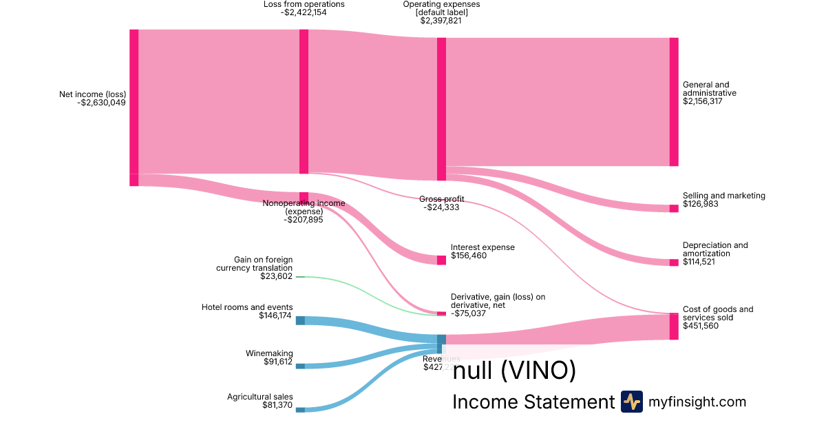 For the quarter ending 2024-06-30, VINO made $427,227 in revenue. -$2,630,049 in net income. Net profit margin of -615.61%.
