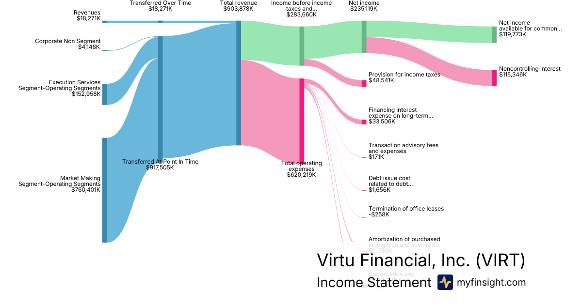 For the year ending 2025-12-31, VIRT made $3,632,118K in revenue. $468,361K in net income. Net profit margin of 12.89%.