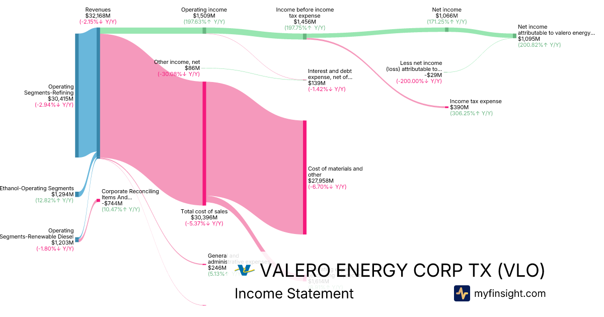 For the quarter ending 2025-09-30, VLO made $32,168M in revenue. $1,095M in net income. Net profit margin of 3.40%.