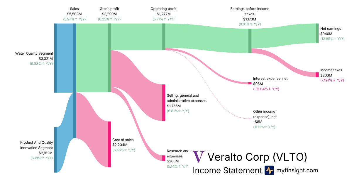 For the year ending 2025-12-31, VLTO made $5,503M in revenue. $940M in net income. Net profit margin of 17.08%.