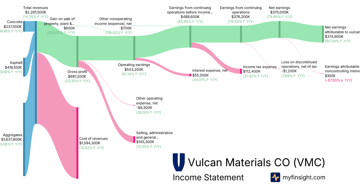 For the quarter ending 2025-09-30, VMC made $2,291,500K in revenue. $374,900K in net income. Net profit margin of 16.36%.