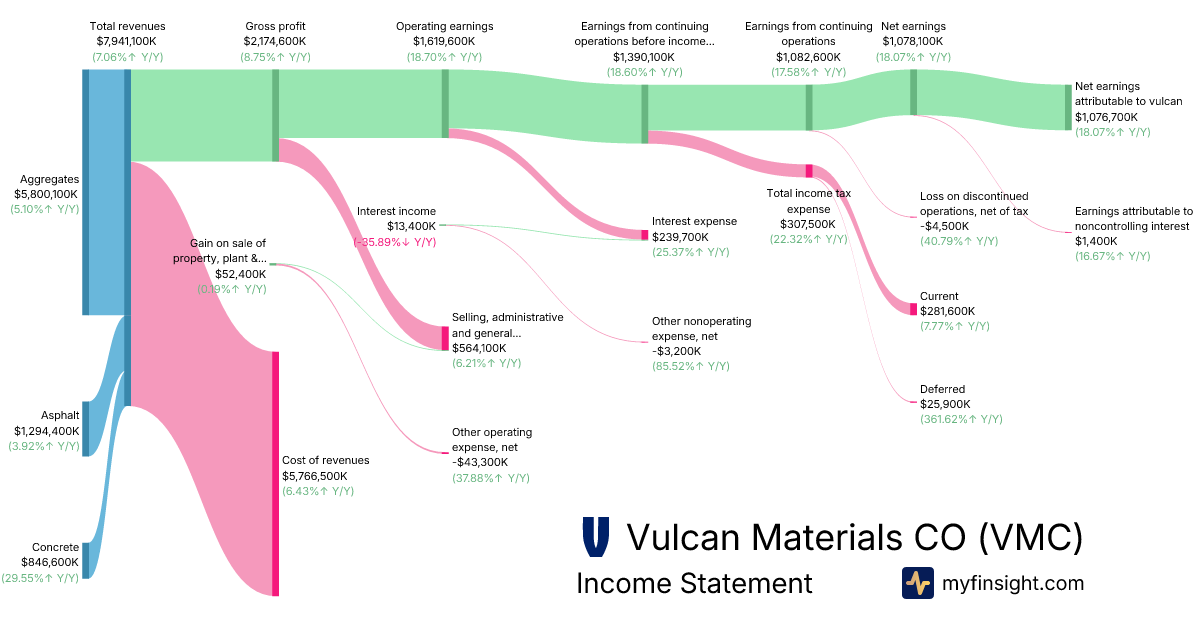 For the year ending 2025-12-31, VMC made $7,941,100K in revenue. $1,076,700K in net income. Net profit margin of 13.56%.