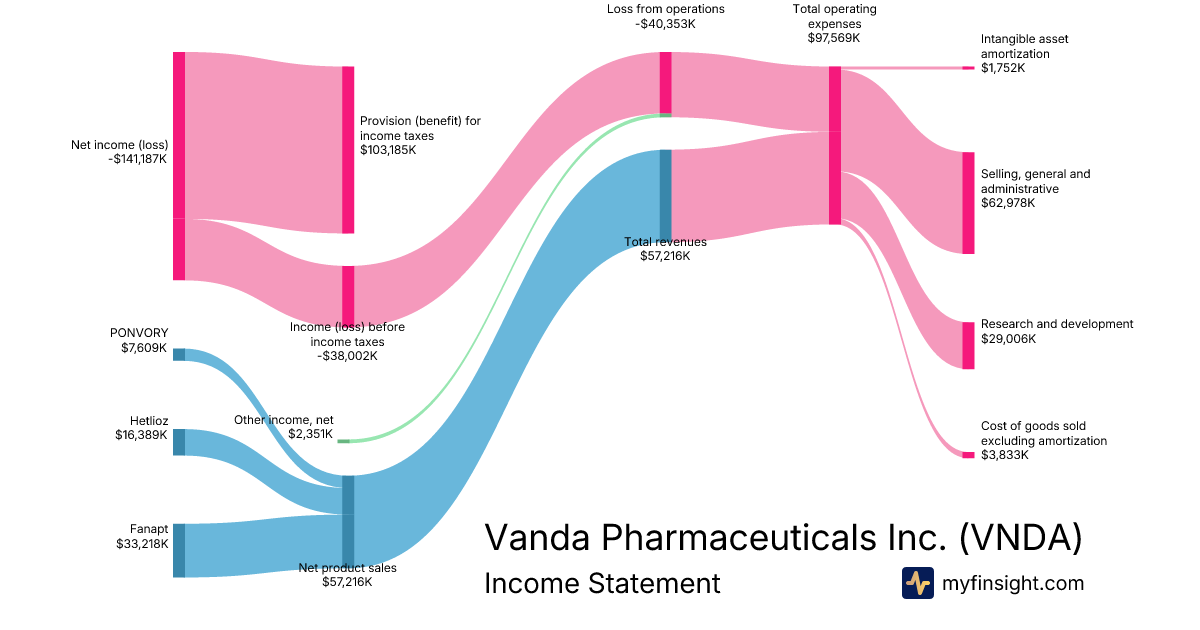 For the year ending 2025-12-31, VNDA made $216,105K in revenue. -$220,474K in net income. Net profit margin of -102.02%.