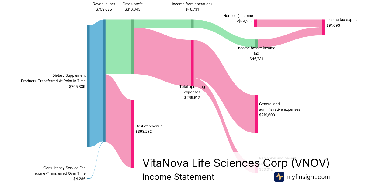 For the quarter ending 2026-01-31, VNOV made $709,625 in revenue. -$44,362 in net income. Net profit margin of -6.25%.