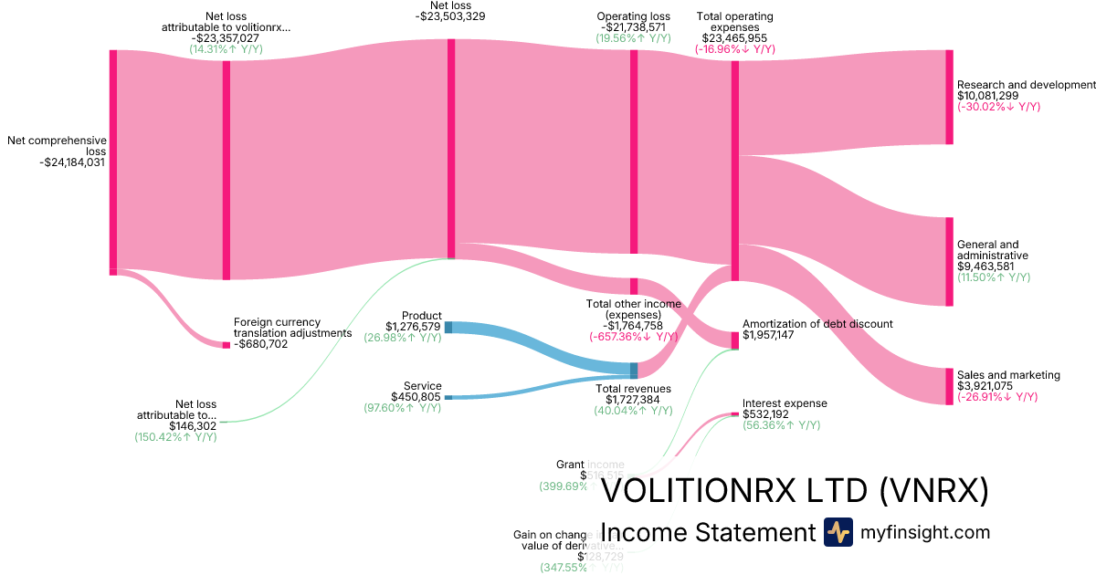 For the year ending 2025-12-31, VNRX made $1,727,384 in revenue. -$24,184,031 in net income. Net profit margin of -1400.04%.