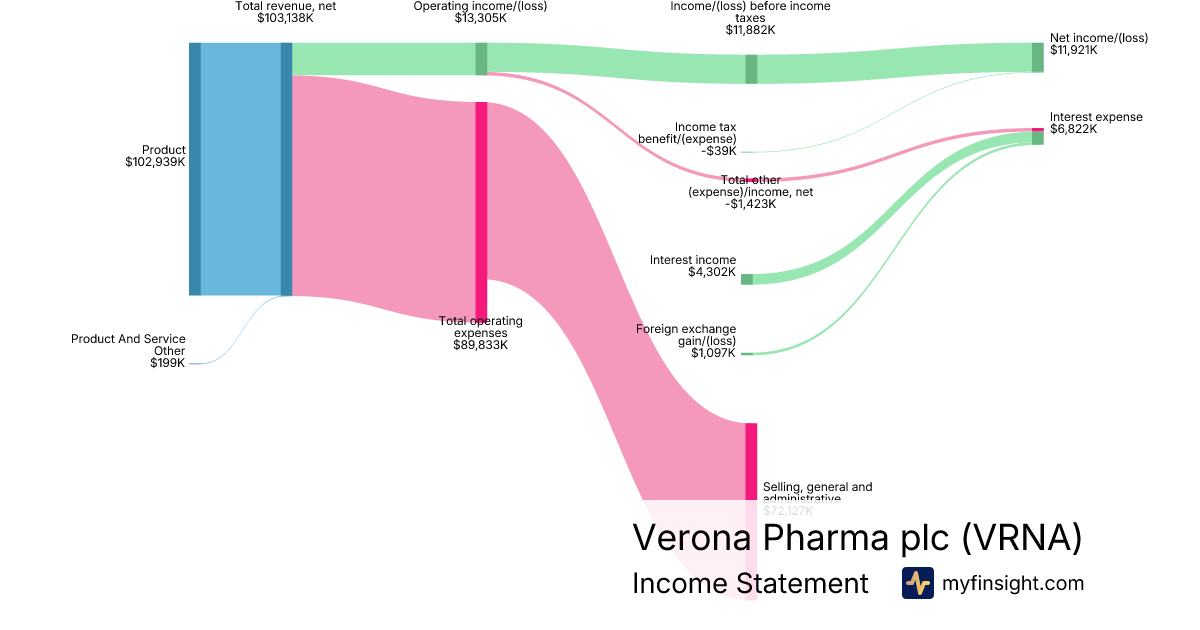 For the quarter ending 2025-06-30, VRNA made $103,138K in revenue. $11,921K in net income. Net profit margin of 11.56%.
