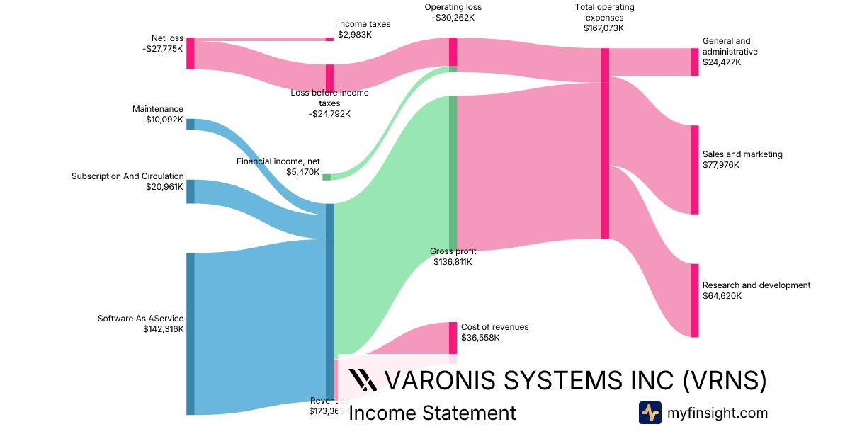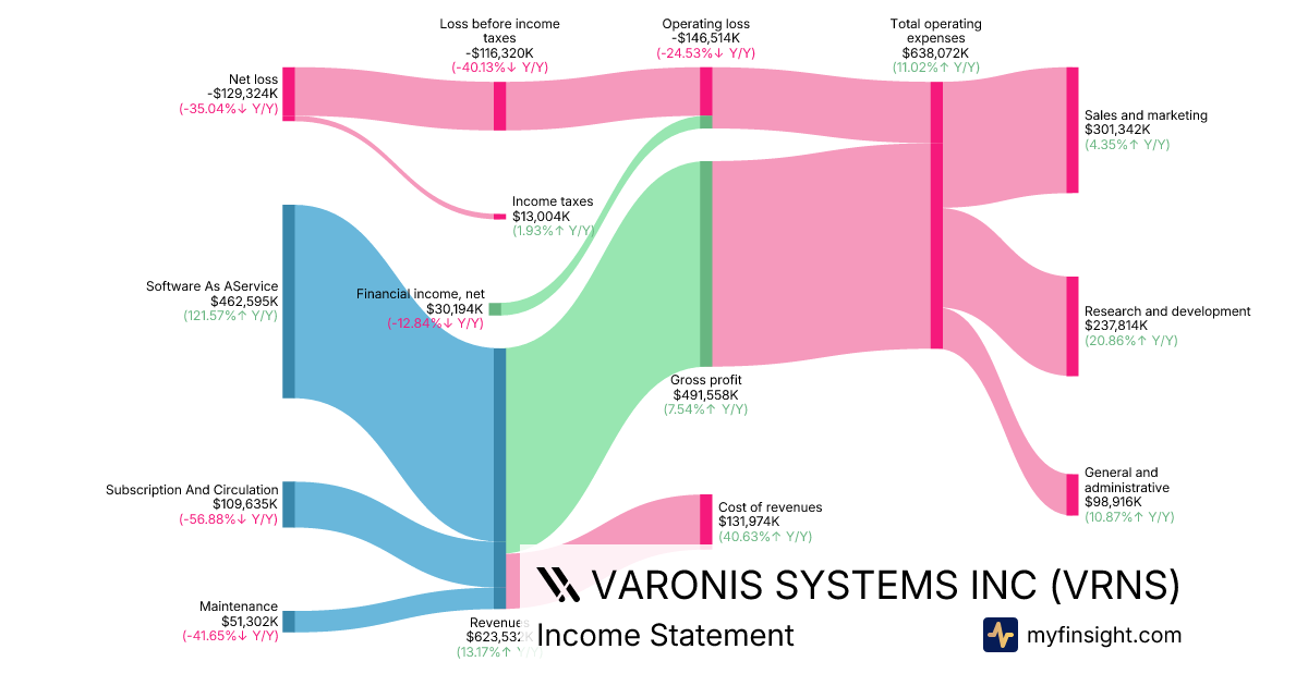 For the year ending 2025-12-31, VRNS made $623,532K in revenue. -$129,324K in net income. Net profit margin of -20.74%.