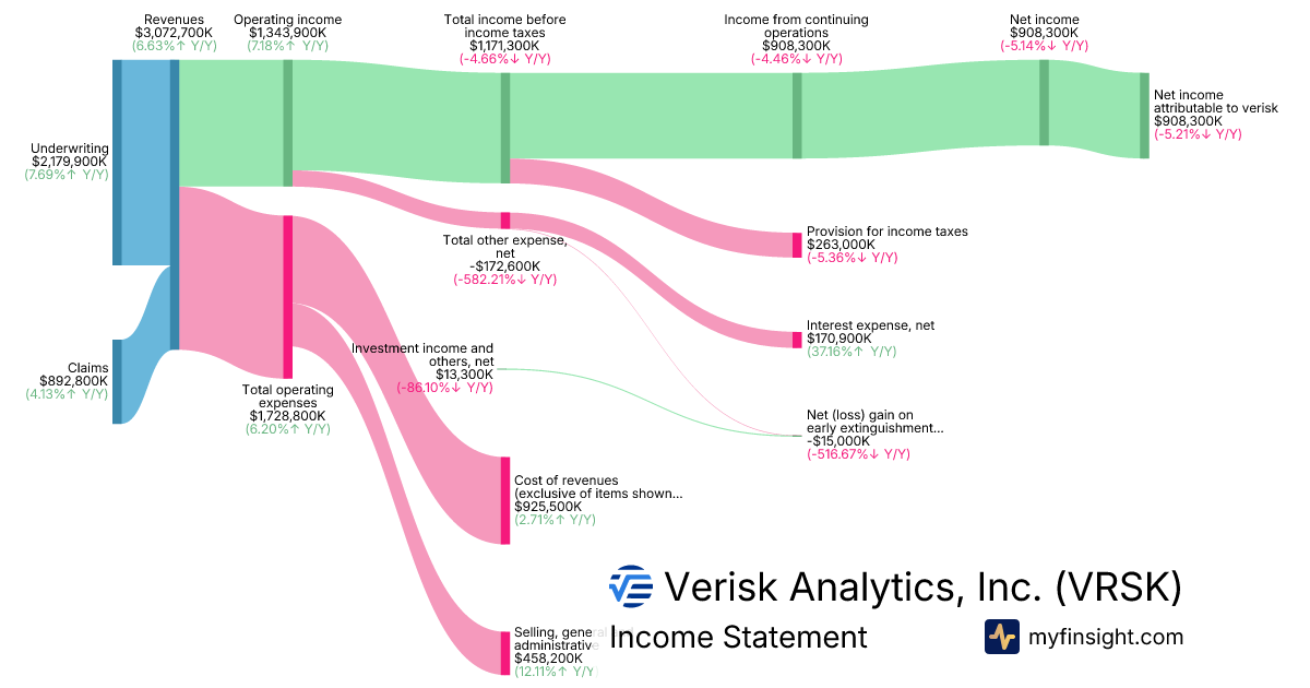 For the year ending 2025-12-31, VRSK made $3,072,700K in revenue. $908,300K in net income. Net profit margin of 29.56%.