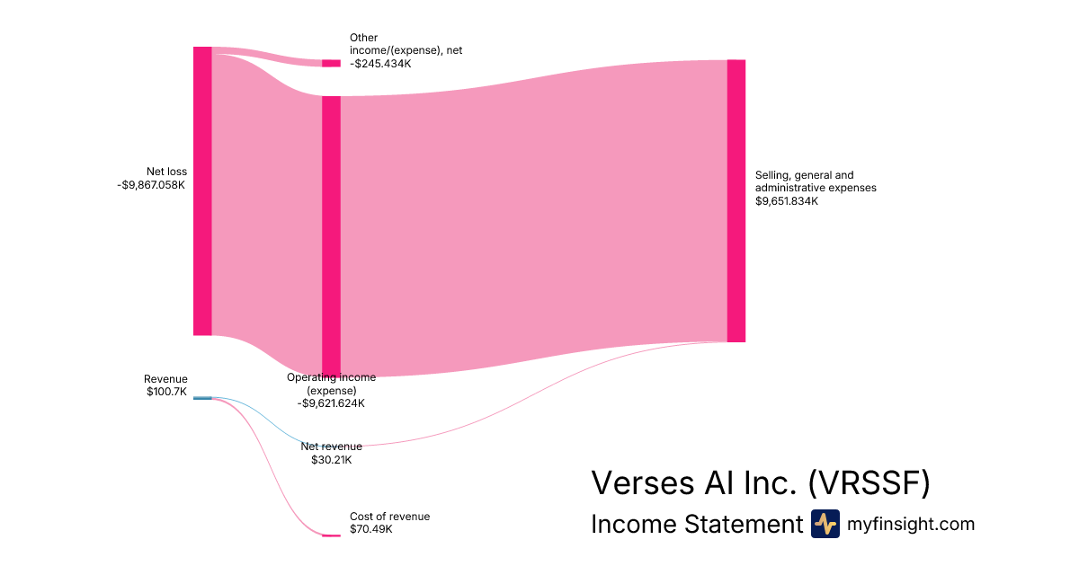 For the quarter ending 2025-09-30, VRSSF made $100.7K in revenue. -$9,867.058K in net income. Net profit margin of -9798.47%.