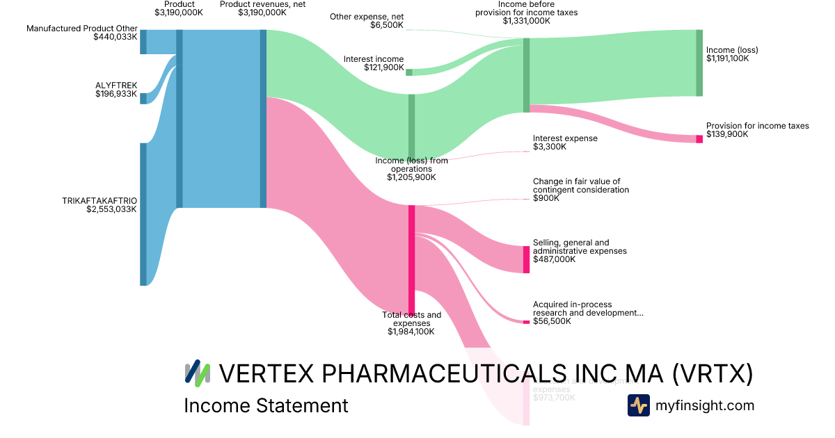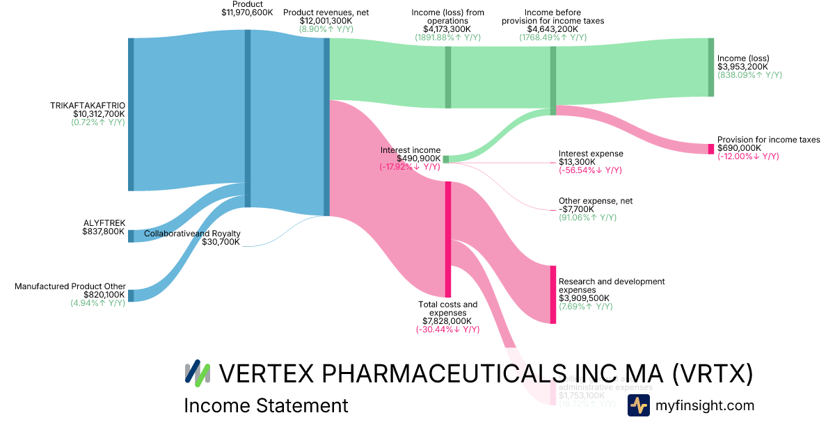 For the year ending 2025-12-31, VRTX made $12,001,300K in revenue. $3,953,200K in net income. Net profit margin of 32.94%.