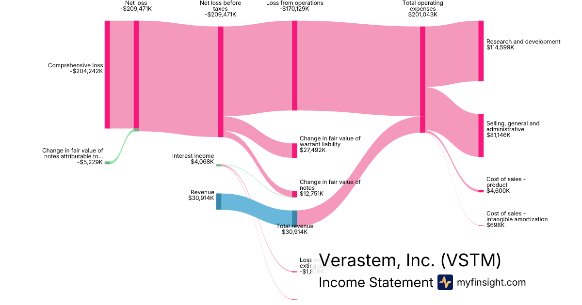 For the year ending 2025-12-31, VSTM made $30,914K in revenue. -$204,242K in net income. Net profit margin of -660.68%.
