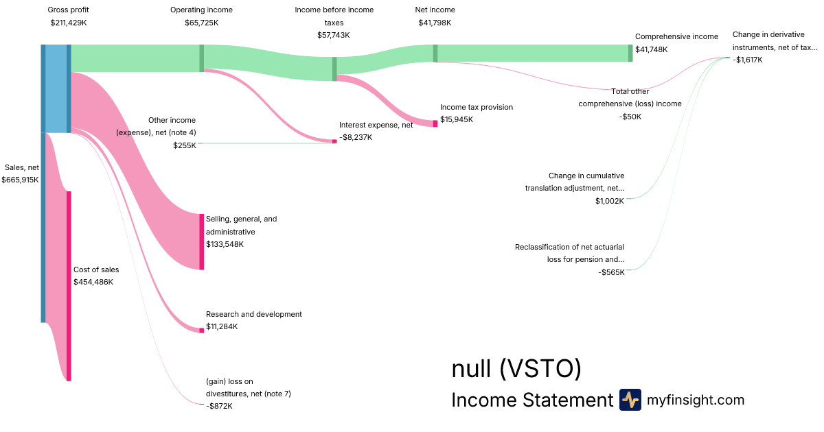For the quarter ending 2024-09-30, VSTO made $665,915K in revenue. $41,748K in net income. Net profit margin of 6.27%.