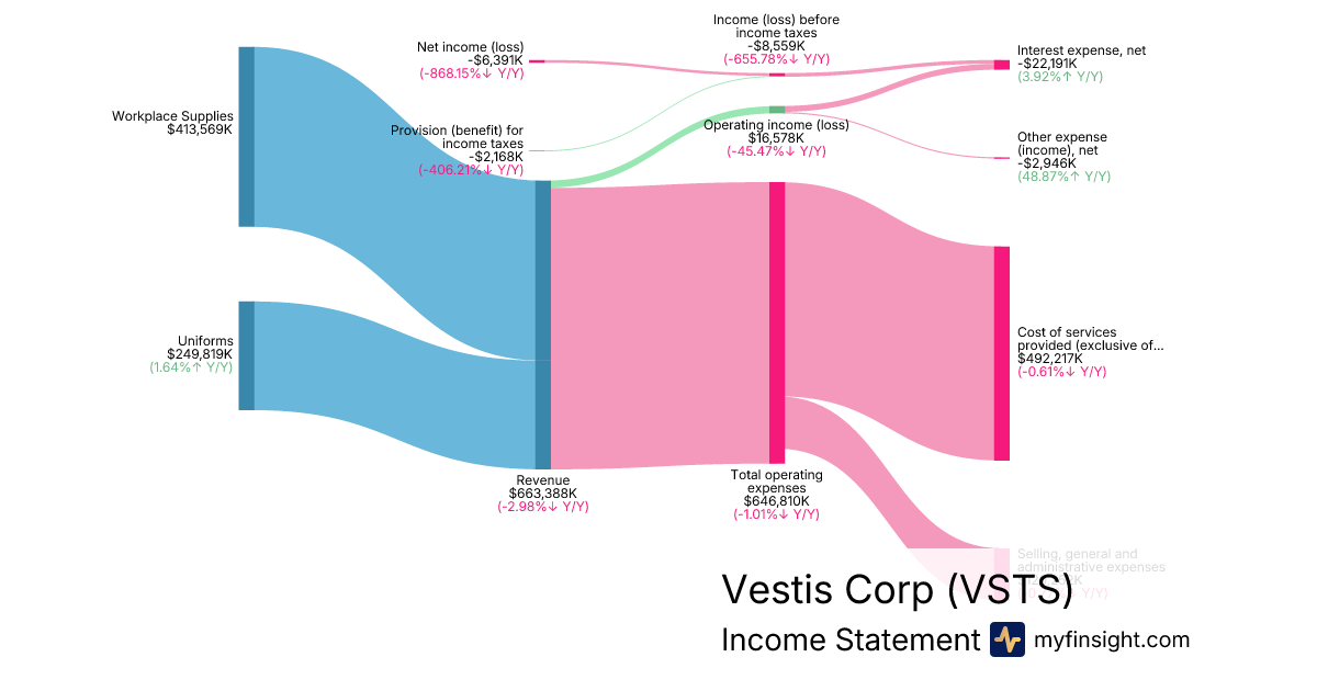 For the quarter ending 2026-01-02, VSTS made $663,388K in revenue. -$6,391K in net income. Net profit margin of -0.96%.
