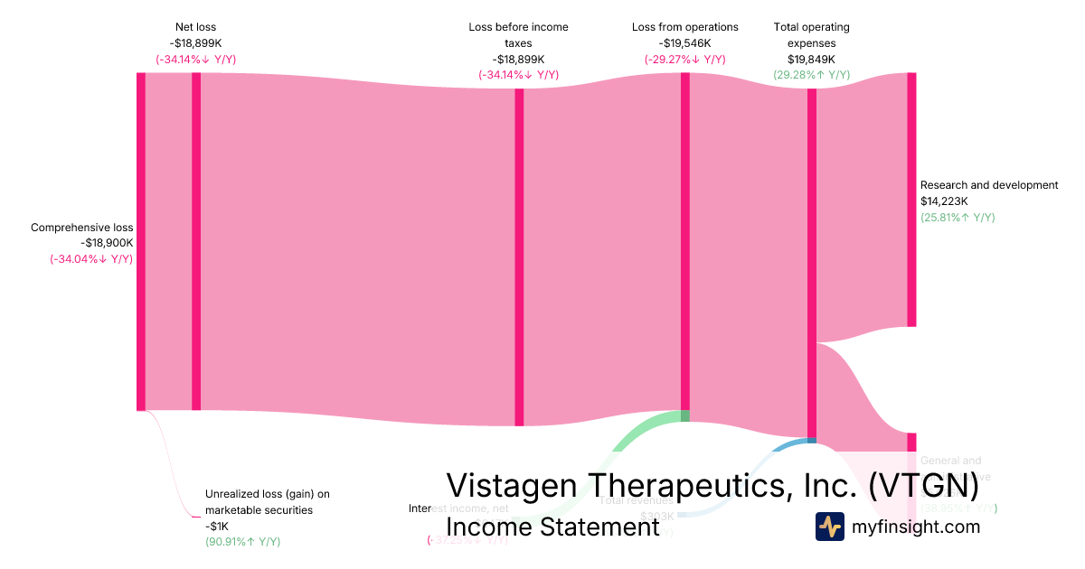 For the quarter ending 2025-12-31, VTGN made $303K in revenue. -$18,900K in net income. Net profit margin of -6237.62%.