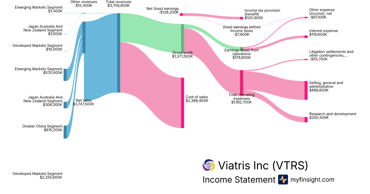 For the quarter ending 2025-09-30, VTRS made $3,759,900K in revenue. -$128,200K in net income. Net profit margin of -3.41%.