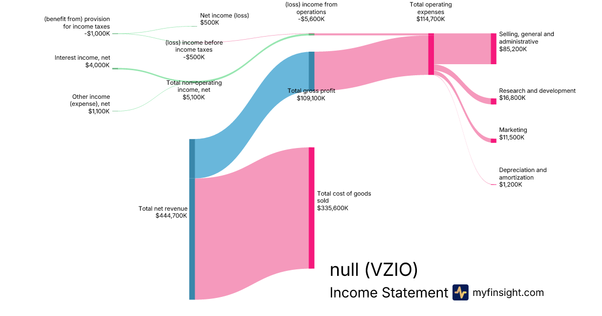 For the quarter ending 2024-09-30, VZIO made $444,700K in revenue. $500K in net income. Net profit margin of 0.11%.