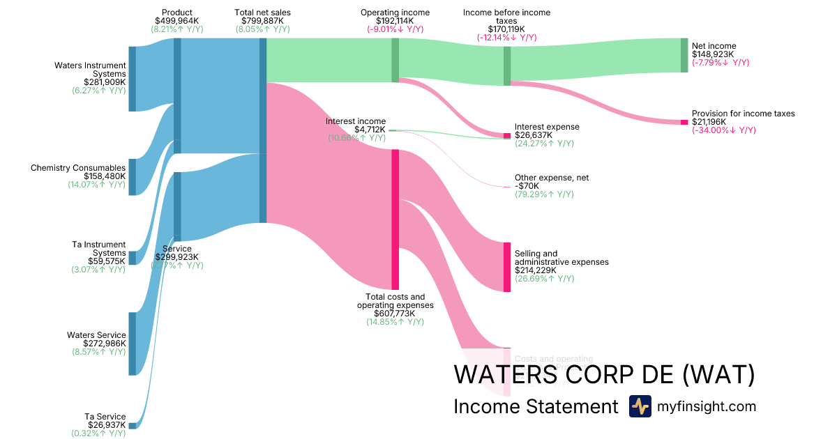 For the quarter ending 2025-09-27, WAT made $799,887K in revenue. $148,923K in net income. Net profit margin of 18.62%.