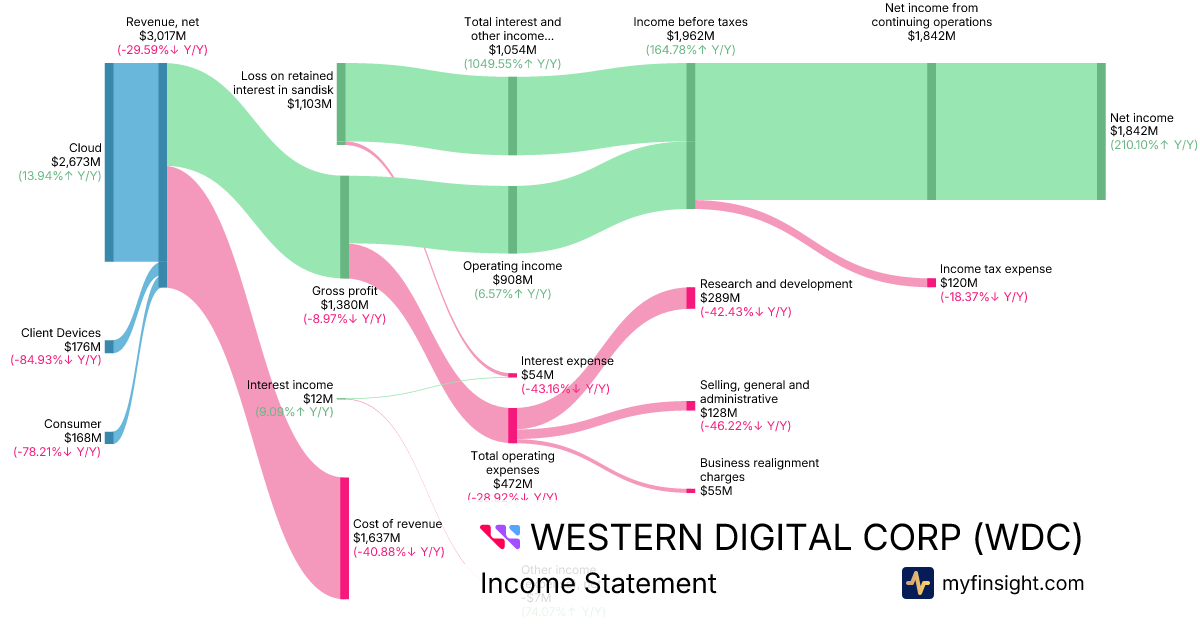 For the quarter ending 2026-01-02, WDC made $3,017M in revenue. $1,842M in net income. Net profit margin of 61.05%.
