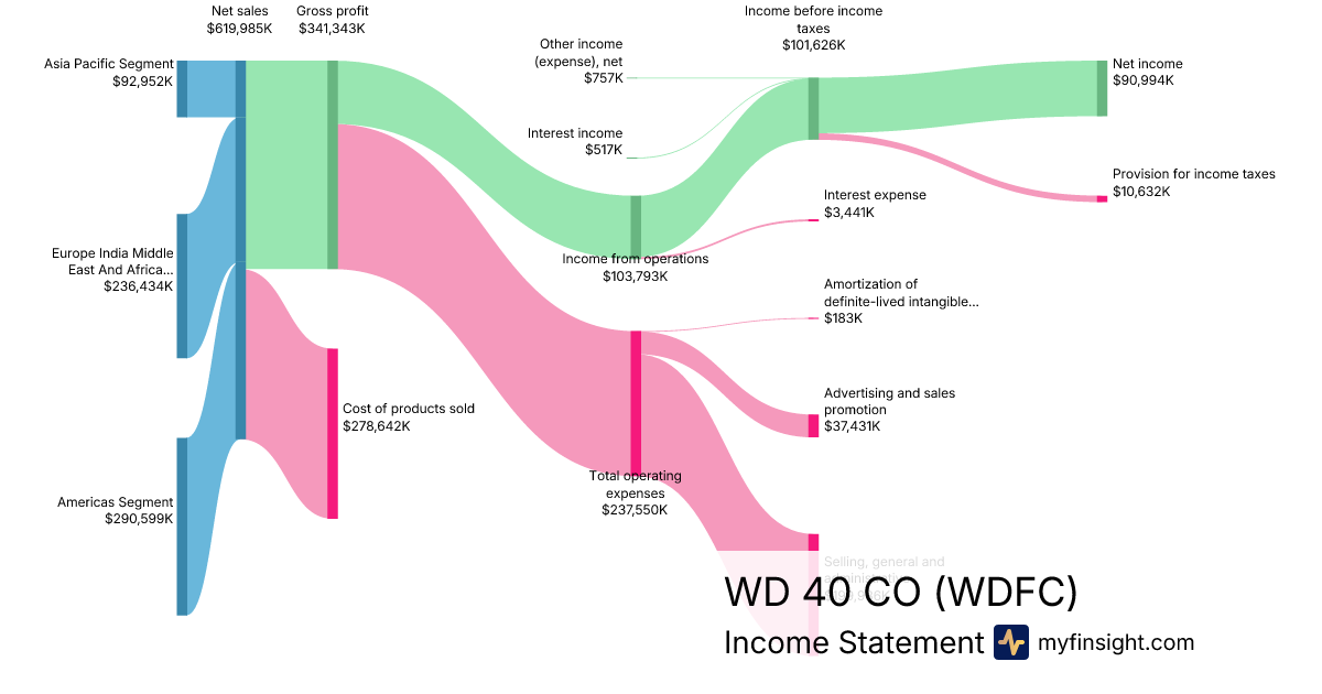 For the year ending 2025-08-31, WDFC made $619,985K in revenue. $90,994K in net income. Net profit margin of 14.68%.