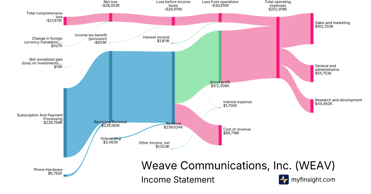 For the year ending 2025-12-31, WEAV made $239,024K in revenue. -$27,611K in net income. Net profit margin of -11.55%.