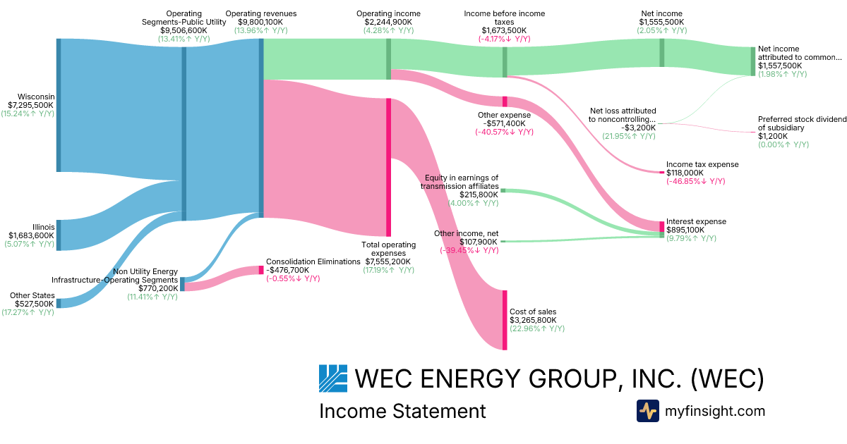 For the year ending 2025-12-31, WEC made $9,800,100K in revenue. $1,557,500K in net income. Net profit margin of 15.89%.